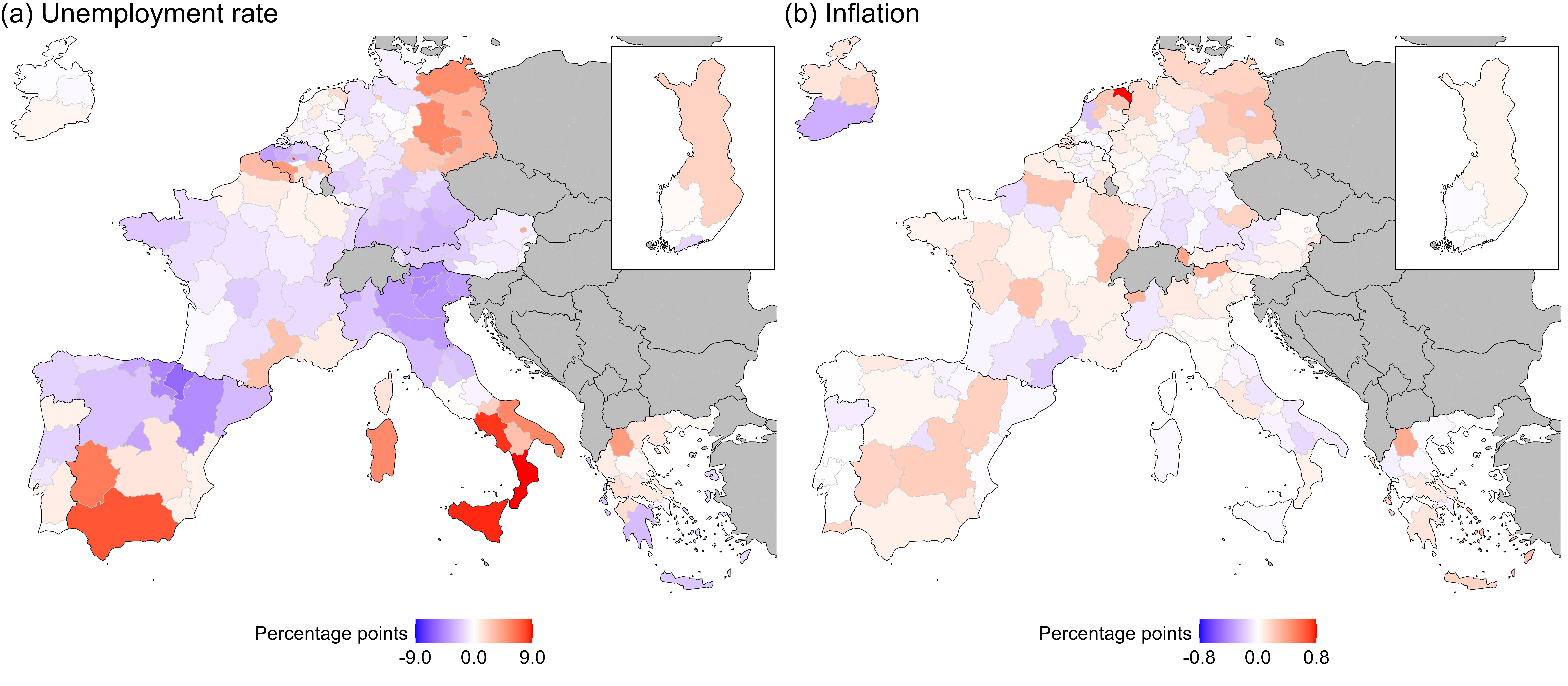Unlike previous euro area studies, which typically rely on country-level data, our regional approach offers a key advantage: there is substantially more variation in the data (see, for example, Eser et al., 2020), which helps identify the relationship between inflation and economic slack (McLeay and Tenreyro, 2019; Hazell et al., 2022; Smith et al., 2025). Our analysis uses regional unemployment rates as the measure of economic slack and the GDP deflator as the measure of changes in regional prices.