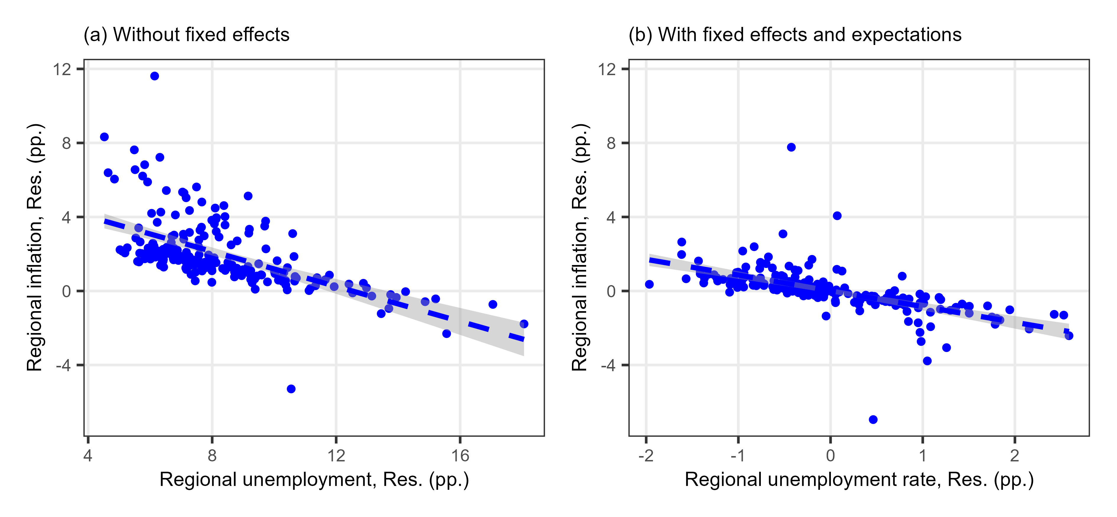 By controlling for time-invariant regional characteristics and for shocks common to all euro area regions, we isolate the region-specific relationship between inflation and economic slack. When we include region and time fixed effects, we find a slope of -0.19, indicating that inflation continues to respond to changes in regional unemployment, consistent with the Phillips curve.